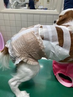最近、犬猫の紙オシメは優れた製品が多いのですが、これは本当にいい商品なので紹介します。お腹のオシメ滑り止めがギャザー状に工夫されています。先日治療で入院されたワンちゃんがはめていました。猫も犬もお腹の部分がくびれが無くさらに被毛でおおわれているのですぐに脱げてしまいます。私は外科用テープや養生テープで止めたりしていましたが、普段は全くひっつかなくて困るテープですが、こんな時だけえげつなく被毛にへばりつき外すときに毛を巻き込んだりします。でもこのおむつなら安心で思わずこのギャザーの部分だけ再利用できないかなあと考えたりします。少し高価な商品だと思いますが、色々な会社から販売されていると思います。是非、お試しください。